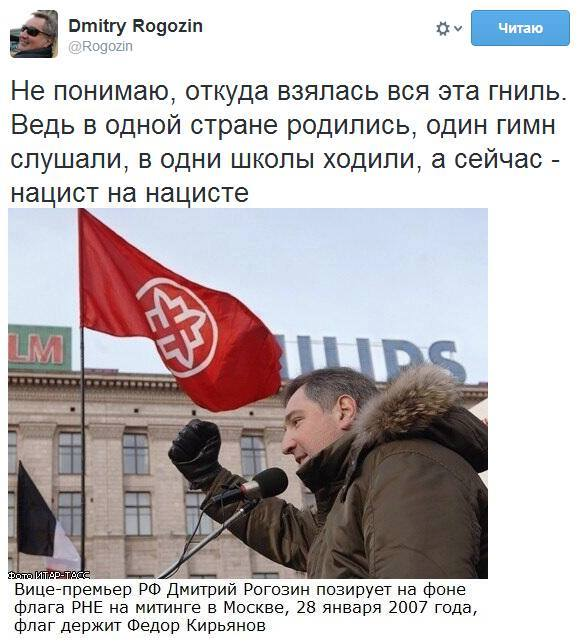 Цитата полностью: "Не понимаю, откуда взялась вся эта гниль. Ведь в одной стране родились, один гимн слушали, в одни школы ходили, а сейчас - нацист на нацисте" (с).